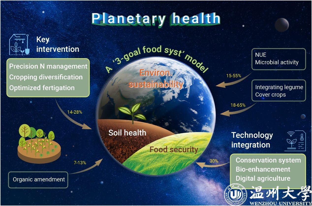 近日,我校生环学院生态学学科团队赵敏/甘延太/王丽在Cell Press综合性期刊Innovation发表题为“Integrated strategies for enhancing agrifood productivity, lowering greenhouse gas emissions, and improving soil health”的学术论文。在气候变化背景下,实现粮食安全、生态环境可持续与土壤健康协同发展,是全球生态环境面临的核心挑战。传统粮食生产模式过度追求产能而忽视生态韧性,加剧了土壤退化、温室气体排放和资源低效利用。研究基于对全球39,162项研究的二次荟萃分析系统评估了全球现代生态创新技术在粮食安全、低碳减排及土壤修复中的作用,揭示“粮食安全-环境友好-土壤健康”协同优化的关键驱动机制,建立了实现“增产、减排、土壤修复”的丰碳壤三维耦衡系统(FCS-3D),为构建高产能、可持续、强韧性的生态新范式奠定了基础,为发展气候智能型韧性生态农业给予策略支撑,为实现联合国可持续发展目标提供了转型路径,规模化实施该系统将重塑全球农业生态新格局。